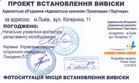 Таким документом був лист від Управління охорони історичного середовища чи Управління архітектури і Проект вивіски з печаткою і підписом від Управління архітектури, а якщо вивіска знаходилась в історичній частині Львова, то додатково з печаткою і підписом начальника УОІС. Також обов’язково мав бути штамп КП “АТУ”, що проект вивіски в них зареєстрований. З лютого 2017 року документом, що підтверджує погодження вивіски залишається лист від УОІС, якщо вивіска в історичній частині Львова або на пам’ятці архітектури, в іншому випадку від Управління регулювання забудови департаменту містобудування. Однак тепер на Паспорті вивіски (раніше він називався Проектом вивіски) підписи і печатки ніхто не ставить, замість цього ставлять штамп з відмітками про Номер і дату листа про відповідність малої архітектурної форми (вивіски) до вимог Порядку встановлення вивісок у місті Львові; Номер і дату протоколу робочої групи, яка розглядала можливість погодження вивіски; Реєстраційний номер в КП “Адміністративно-технічне управління”.