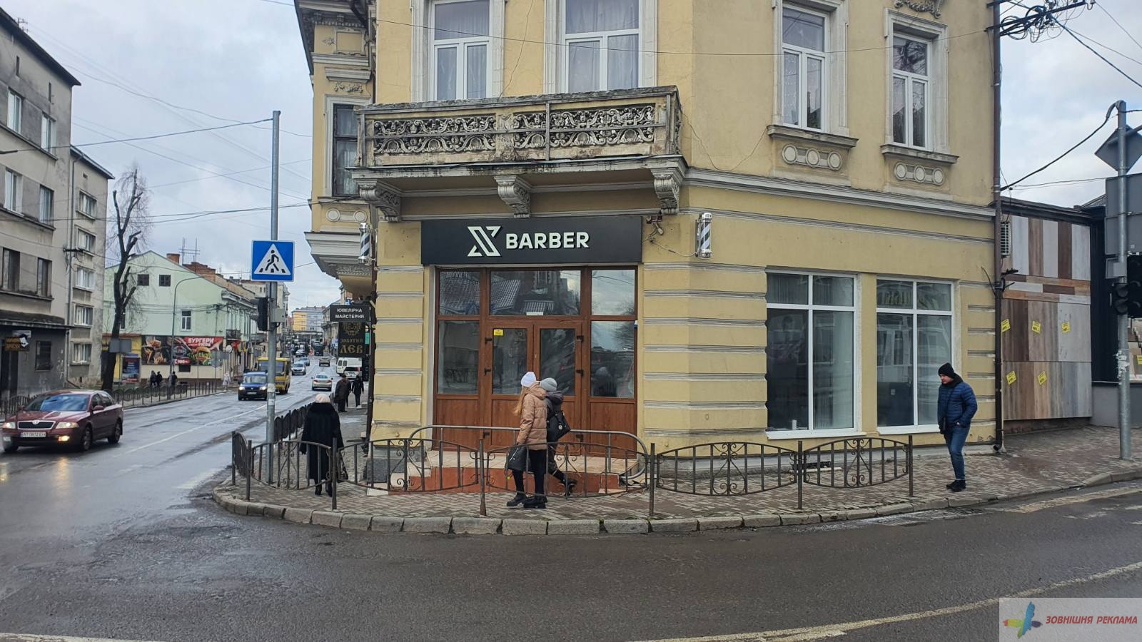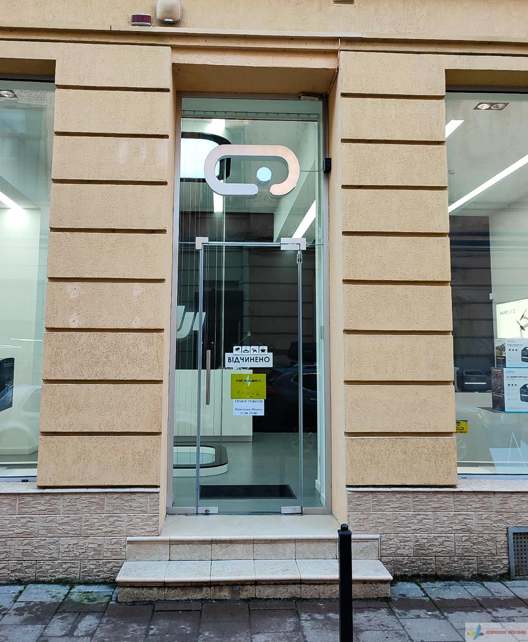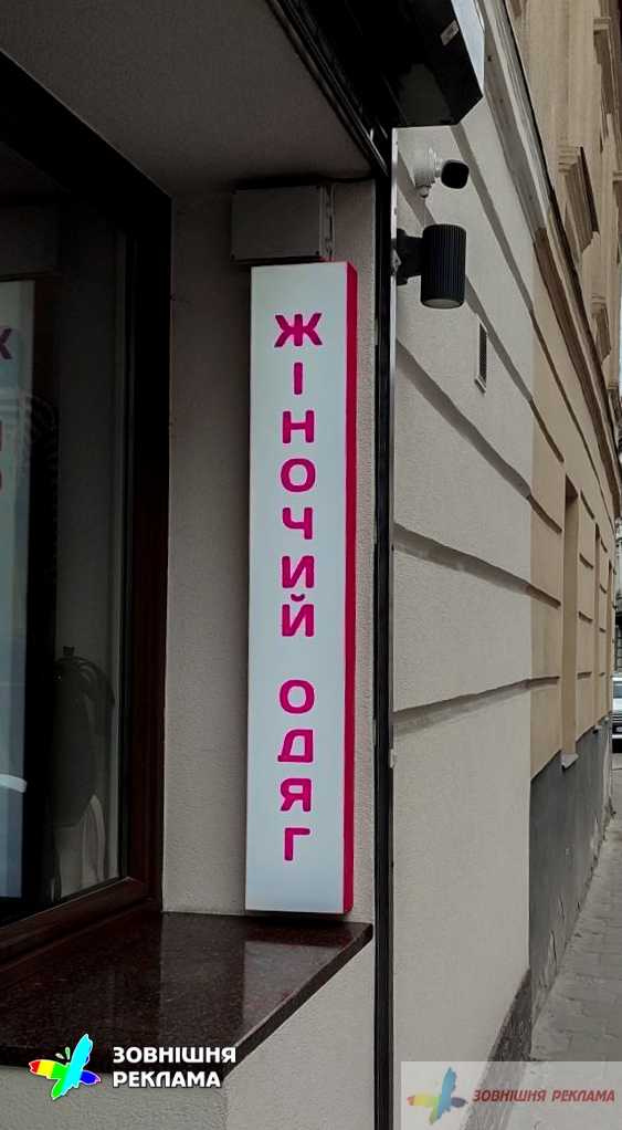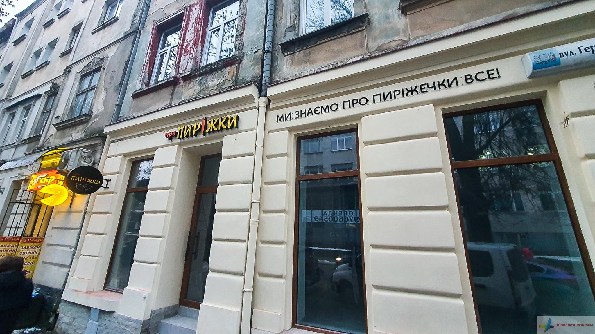 Вивіска з об'ємних літер, фронтальна підсвітка. Матеріали: акрил кольоровий. Вивіска може бути погодженна у межах історичного середовища. Вивіска торцева - касетон, підсвітка в прорізь.