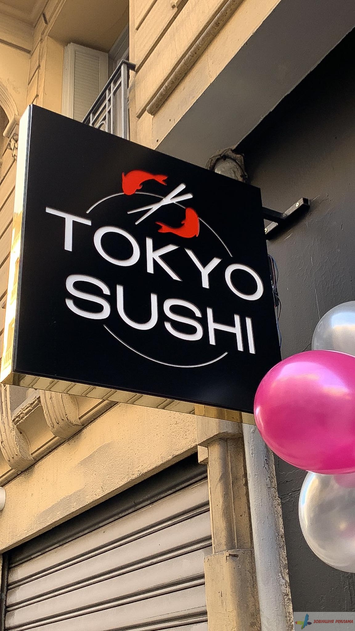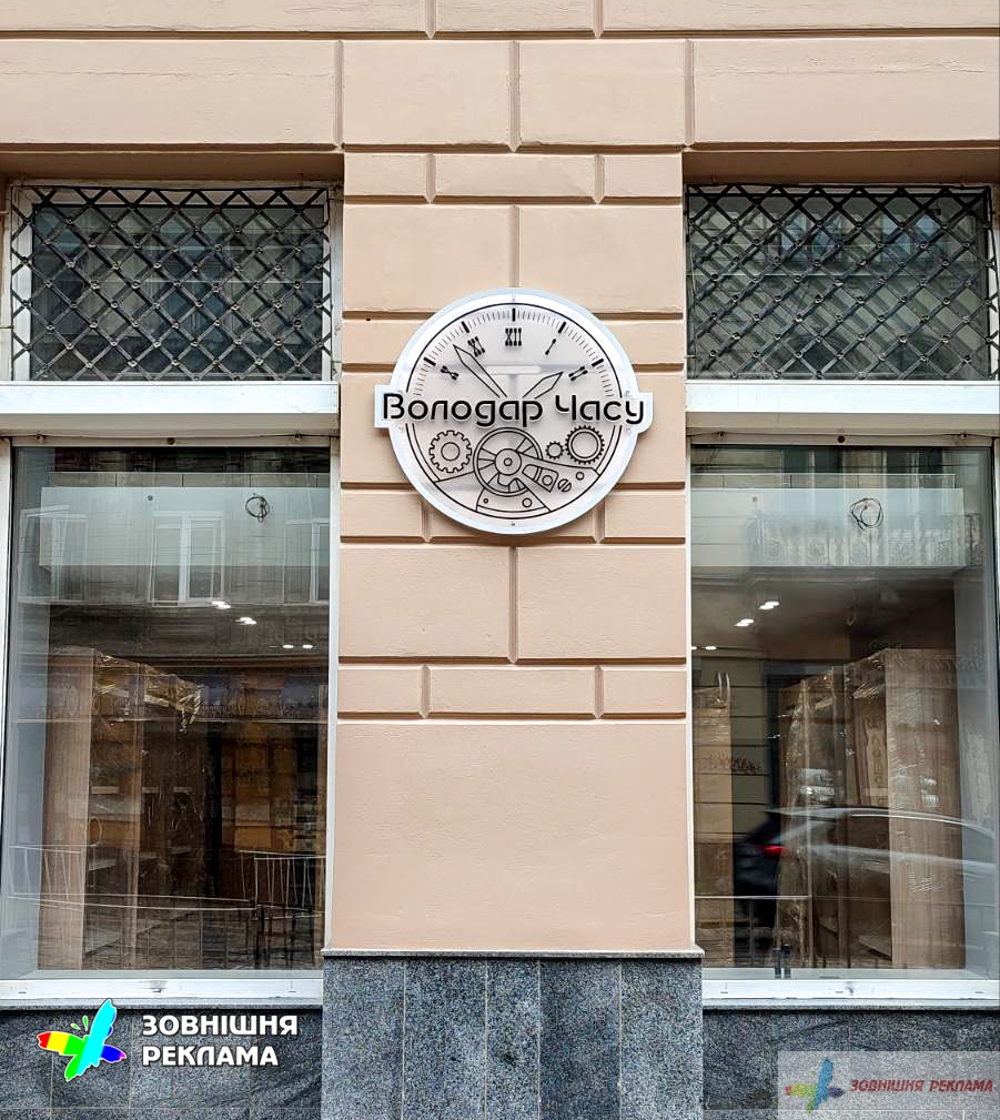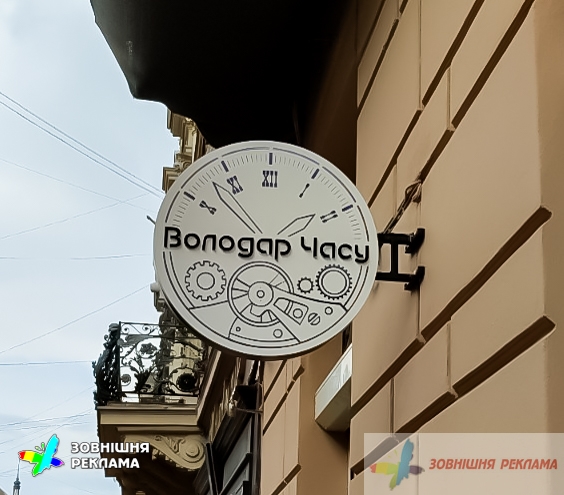 Вивіска торцева - касетон, підсвітка в прорізь. Матеріали: основа - композит, виклейка - кольорова плівка RITRAMA, підкладка - молочний акрил. Вивіска може бути погодженна у межах історичного середовища.